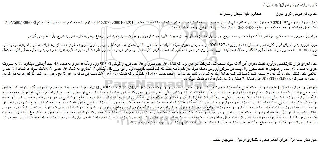 شماره پرونده اجرایی0201597 شعبه اول اجرای احکام مدنی اردبیل به موجب درخواست اجرای حکم به شماره دادنامه مربوطه 140207390001042935 محکوم علیه محکوم است به پرداخت مبلغ 6/600/000/000 ریال بابت اصل خواسته در حق محکوم له و مبلغ 330/000/000 ریال بابت نیم عشردولتی درحق صندوق دولت.
