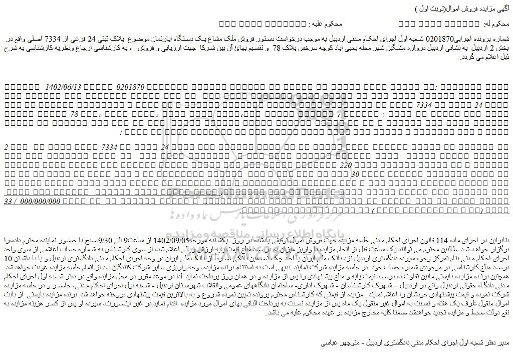 مزایده  فروش ملک مشاع یک دستگاه اپارتمان موضوع  پلاک ثبتی 24 فرعی از 7334 اصلی