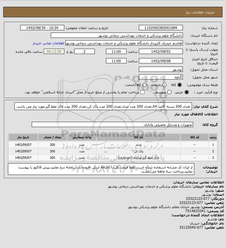استعلام تعداد 200 بسته کاغذ A4،تعداد 200 عدد مداد،تعداد 200 عدد پاک کن،تعداد 200 عدد لاک غلط گیر،مورد نیاز می باشد., استعلام تعداد 200 بسته کاغذ A4،تعداد 200 عدد مداد،تعداد 200 عدد پاک کن،تعداد 200 عدد لاک غلط گیر،مورد نیاز می باشد.