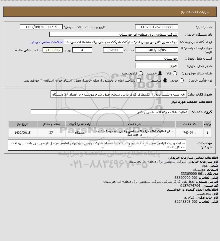 شرح کلی نیاز: رفع عیب و نشت یابی از کلیدهای گازی پارس سوئیچ طبق شرح پیوست - به تعداد 27 دستگاه