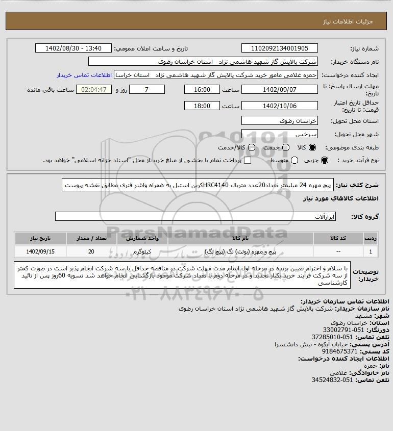 | 1 | -- | پیچ و مهره (بولت) لگ (پیچ لگ) | کیلوگرم | 20 | 1402/09/15 |