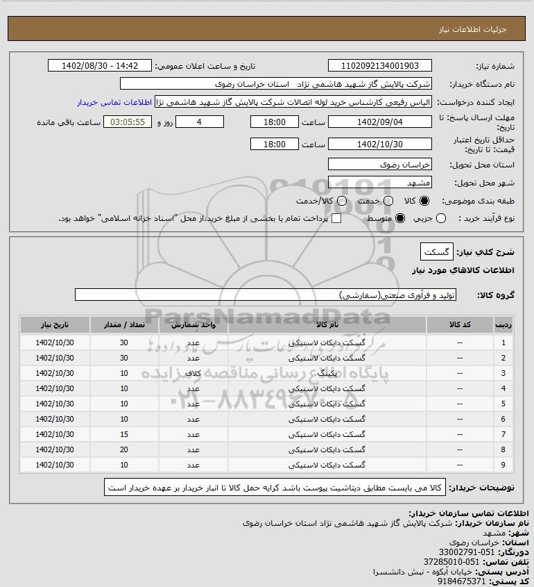 نام دستگاه خریدار:شرکت پالایش گاز شهید هاشمی نژاد استان خراسان رضوی