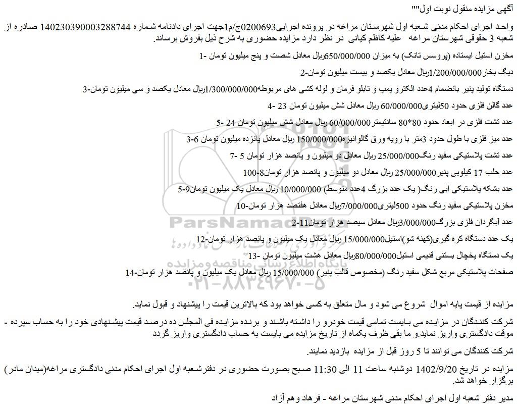 واحد اجرای احکام مدنی شعبه اول شهرستان مراغه در پرونده اجرایی0200693ج/م1جهت اجرای دادنامه شماره 140230390003288744 صادره از شعبه 3 حقوقی شهرستان مراغه علیه کاظم کیانی در نظر دارد مزایده حضوری به شرح ذیل بفروش برساند.