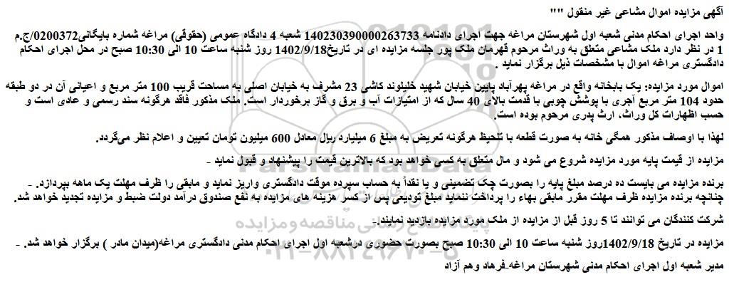 - مزایده در تاریخ 1402/9/18روز شنبه ساعت 10 الی 10:30 صبح بصورت حضوری درشعبه اول اجرای احکام مدنی دادگستری مراغه(میدان مادر ) برگزار خواهد شد.