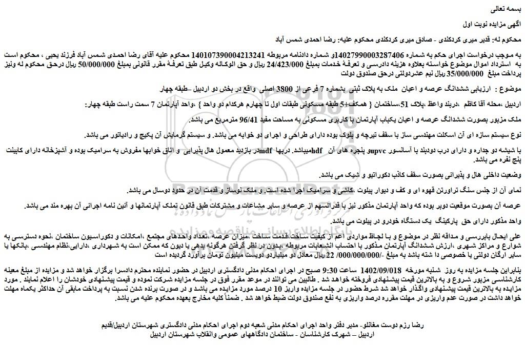 بنابراین جلسه مزایده به روز  شنبه مورخه  1402/09/018  ساعت 9:30 صبح در اجرای احکام مدنی دادگستری اردبیل در حضور نماینده محترم دادسرا برگزار خواهد شد و مزایده از مبلغ معینه کارشناسی مزبور شروع و به بالاترین قیمت پیشنهادی فروخته خواهد شد . طالبین می توانند در موعد مقرر فوق در جلسه مزایده شرکت نموده و قیمت پیشنهادی خودشان را اعلام نمایند . مورد مزایده به بالاترین قیمت پیشنهادی واگذار خواهد شد شرط حضور در جلسه مزایده واریز 10 درصد مورد مزایده می باشد و در صورت برنده شدن نسبت به پرداخت مابقی آن حداکثر یکماه مهلت خواهد داشت در صورت عدم واریزی در مهلت مقرره درصد واریزی به نفع صندوق دولت ضبط خواهد شد . ضمناً کلیه مخارج بعهده محکوم علیه می باشد.