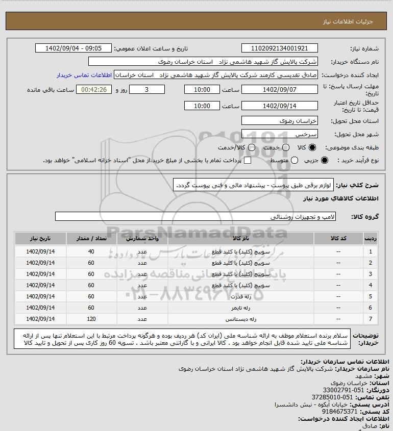 نام دستگاه خریدار:شرکت پالایش گاز شهید هاشمی نژاد استان خراسان رضوی