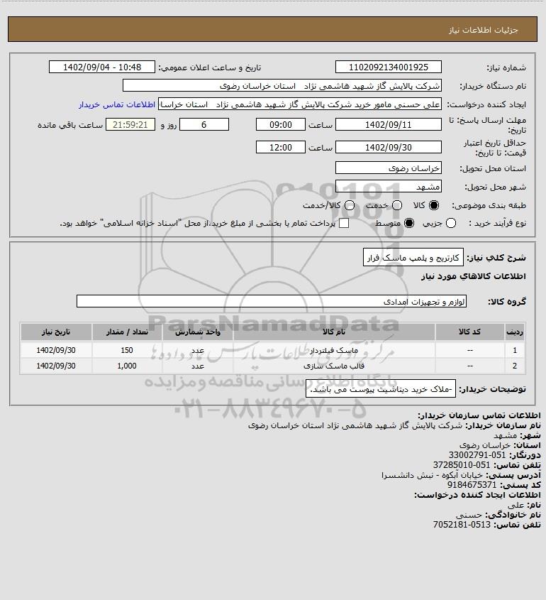 نام دستگاه خریدار:شرکت پالایش گاز شهید هاشمی نژاد استان خراسان رضوی