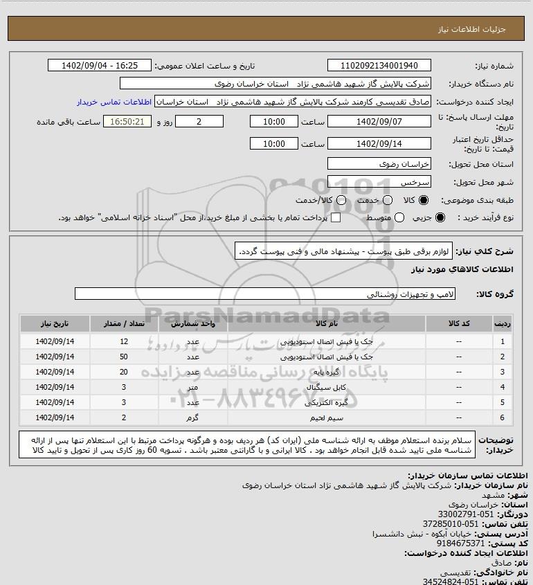 نام دستگاه خریدار:شرکت پالایش گاز شهید هاشمی نژاد استان خراسان رضوی