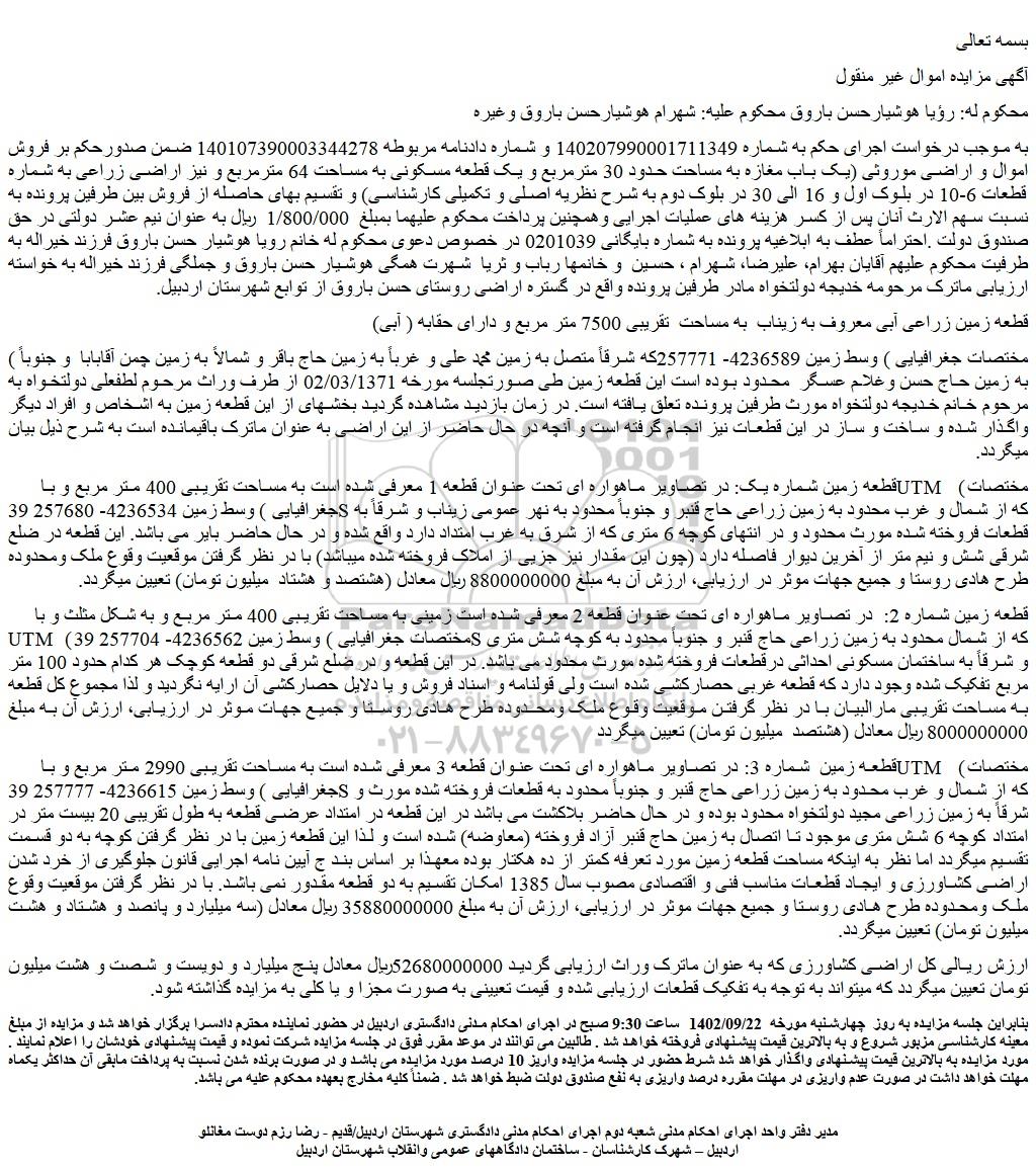 به موجب درخواست اجرای حکم به شماره 140207990001711349 و شماره دادنامه مربوطه 140107390003344278 ضمن صدورحکم بر فروش اموال و اراضی موروثی (یک باب مغازه به مساحت حدود 30 مترمربع و یک قطعه مسکونی به مساحت 64 مترمربع و نیز اراضی زراعی به شماره قطعات 6-10 در بلوک اول و 16 الی 30 در بلوک دوم به شرح نظریه اصلی و تکمیلی کارشناسی) و تقسیم بهای حاصله از فروش بین طرفین پرونده به نسبت سهم الارث آنان پس از کسر هزینه های عملیات اجرایی وهمچنین پرداخت محکوم علیهما بمبلغ 1/800/000 ریال به عنوان نیم عشر دولتی در حق صندوق دولت .احتراماً عطف به ابلاغیه پرونده به شماره بایگانی 0201039 در خصوص دعوی محکوم له خانم رویا هوشیار حسن باروق فرزند خیراله به طرفیت محکوم علیهم آقایان بهرام، علیرضا، شهرام ، حسین و خانمها رباب و ثریا شهرت همگی هوشیار حسن باروق و جملگی فرزند خیراله به خواسته ارزیابی ماترک مرحومه خدیجه دولتخواه مادر طرفین پرونده واقع در گستره اراضی روستای حسن باروق از توابع شهرستان اردبیل.