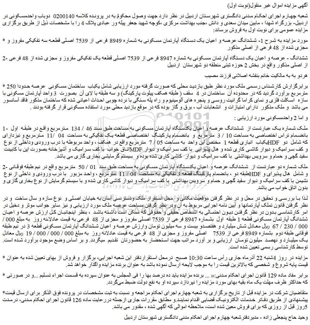 شعبه چهارم اجرای احکام مدنی دادگستری شهرستان اردبیل در نظر دارد جهت وصول محکومٌ به در پرونده کلاسه 0200140 دوباب واحدمسکونی در اردبیل- بزرگراه شهدا ، مابین میدان سعدی و دانش ،جنب بهداشت مرکزی ،کوچه شهید جعفر پیله ور عبادی پلاک 4 را با مشخصات ذیل از طریق برگزاری مزایده عمومی برای نوبت اول به فروش برساند: