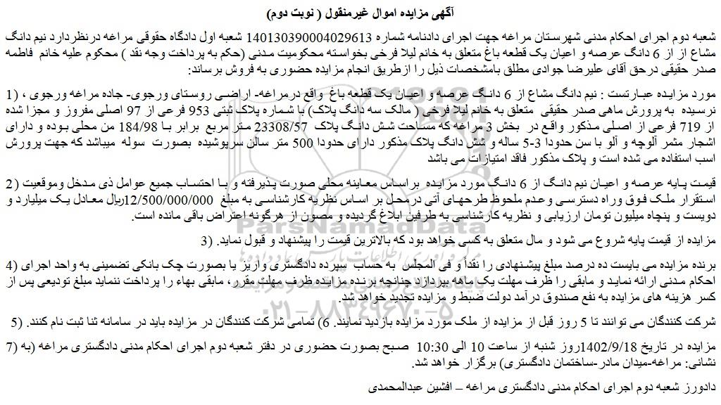 شعبه دوم اجرای احکام مدنی شهرستان مراغه جهت اجرای دادنامه شماره 140130390004029613 شعبه اول دادگاه حقوقی مراغه درنظردارد نیم دانگ مشاع از از 6 دانگ عرصه و اعیان یک قطعه باغ متعلق به خانم لیلا فرخی بخواسته محکومیت مدنی (حکم به پرداخت وجه نقد ) محکوم علیه خانم فاطمه صدر حقیقی درحق آقای علیرضا جوادی مطلق بامشخصات ذیل را ازطریق انجام مزایده حضوری به فروش برساند: