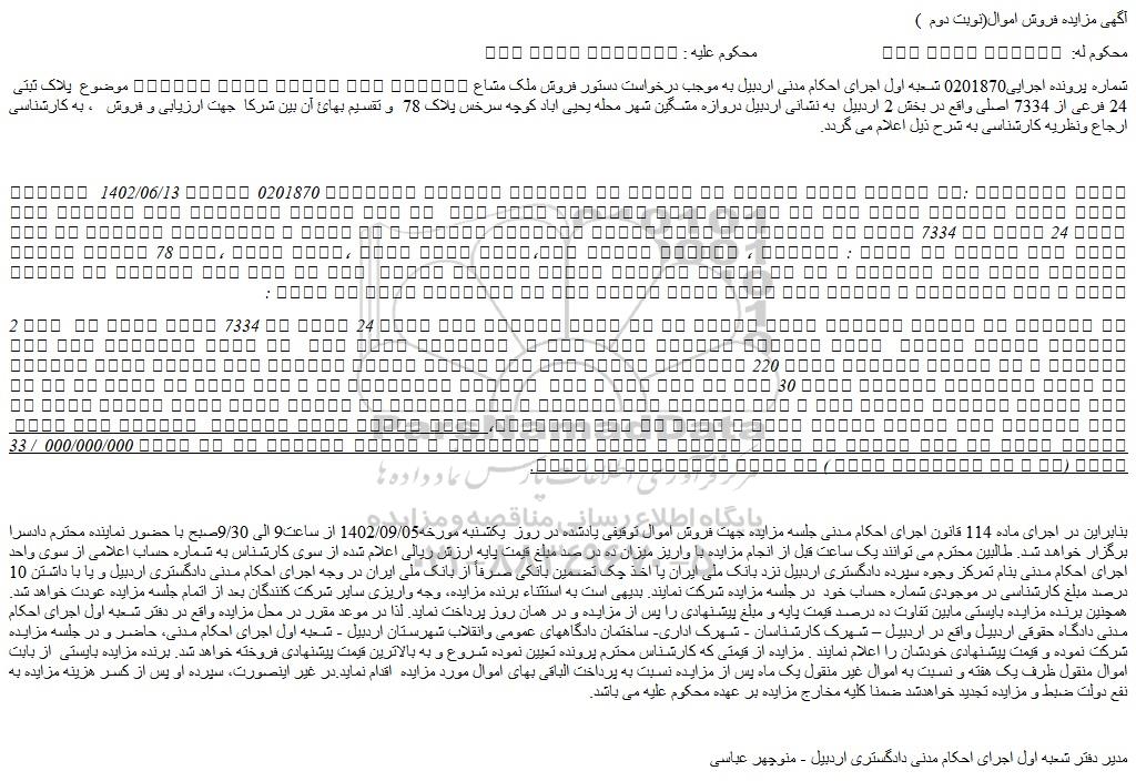 مزایده فروش ملک مشاع ششدانگ پلاک بصورت خانه مسکونی موضوع  پلاک ثبتی 24 فرعی از 7334 اصلی , مزایده فروش ملک مشاع ششدانگ پلاک بصورت خانه مسکونی موضوع  پلاک ثبتی 24 فرعی از 7334 اصلی