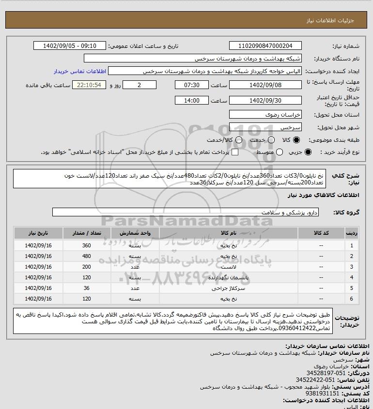 استعلام نخ نایلون3/0کات تعداد360عدد/نخ نایلون2/0کات تعداد480عدد/نخ سیک صفر راند تعداد120عدد/لانست خون تعداد200بسته/سرجی سل 120عدد/نخ سرکلاژ36عدد, استعلام نخ نایلون3/0کات تعداد360عدد/نخ نایلون2/0کات تعداد480عدد/نخ سیک صفر راند تعداد120عدد/لانست خون تعداد200بسته/سرجی سل 120عدد/نخ سرکلاژ36عدد