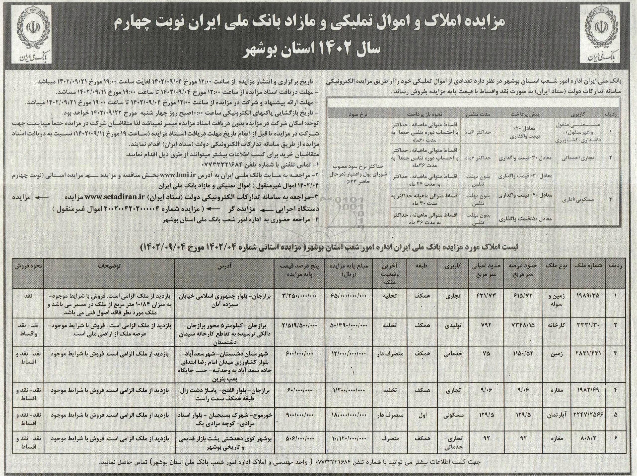 مزایده عمومی مزایده فروش املاک و اموال تملیکی و مازاد کاربری صنعتی ، دامداری ، کشاورزی - تجاری خدماتی - مسکونی - اداری برگزار میگردد. از کلیه افراد متخصص و شرکت‌های واجد شرایط دعوت به عمل می‌آید تا در این مزایده با کد خبرگزاری پارس نماد : 6678183 شرکت نمایند تاریخ شروع مزایده : 1402/09/05 مهلت شرکت در مزایده: تا پایان روز 1402/09/11 مکان برگزاری اموال واگذاری استان‌های بوشهر و دسته‌بندی‌های مربوط به این حراجی املاک و زمین میباشد.