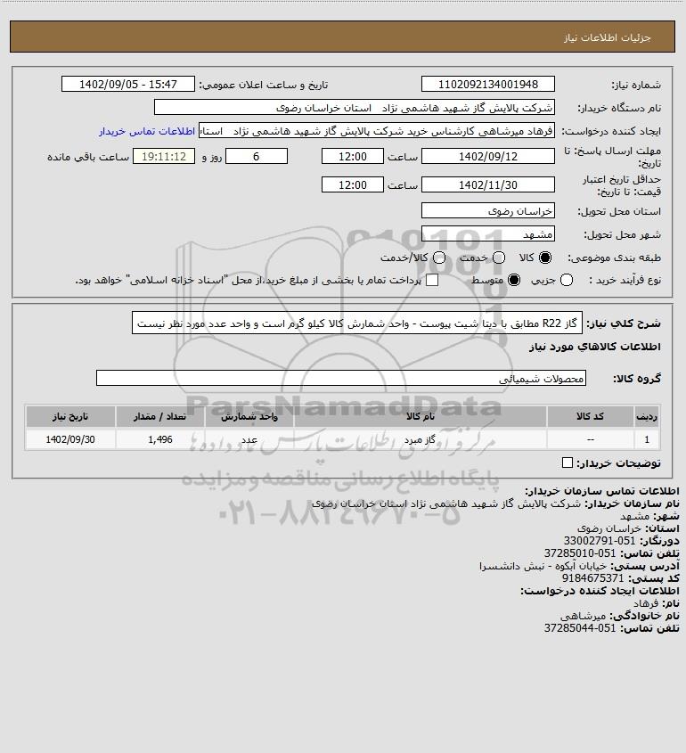 نام دستگاه خریدار:شرکت پالایش گاز شهید هاشمی نژاد استان خراسان رضوی