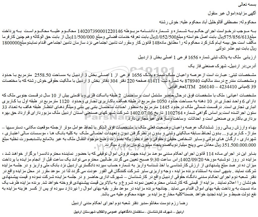 8 مزایده ملک 9810688 1404/08/15 new not special not payed اردبیل