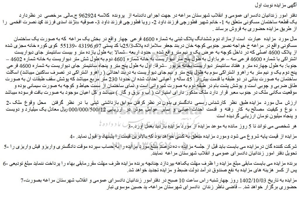 دفتر امور زندانیان دادسرای عمومی و انقلاب شهرستان مراغه در جهت اجرای دادنامه از پرونده کلاسه 962924 ج.مالی. مرخصی در نظردارد یک قطعه ساختمان مسکونی متعلق به 1- خانم شهیر فطورچی فرزند داود 2- رویا فطورچی فرزند داود 3- صوقیه «نژند اسدی فرزند محمد نصرت افخمی را از طریق مزایده حضوری به فروش برساند .