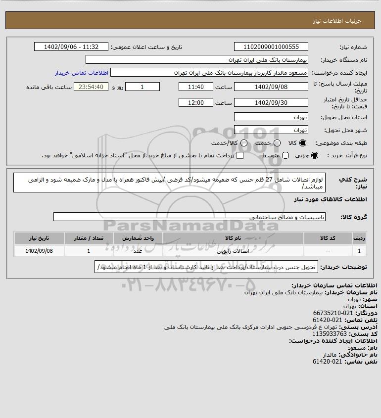 شرح کلی نیاز: لوازم اتصالات شامل 27 قلم جنس که ضمیمه میشود/کد فرضی /پیش فاکتور همراه با مدل و مارک ضمیمه شود و الزامی میباشد/