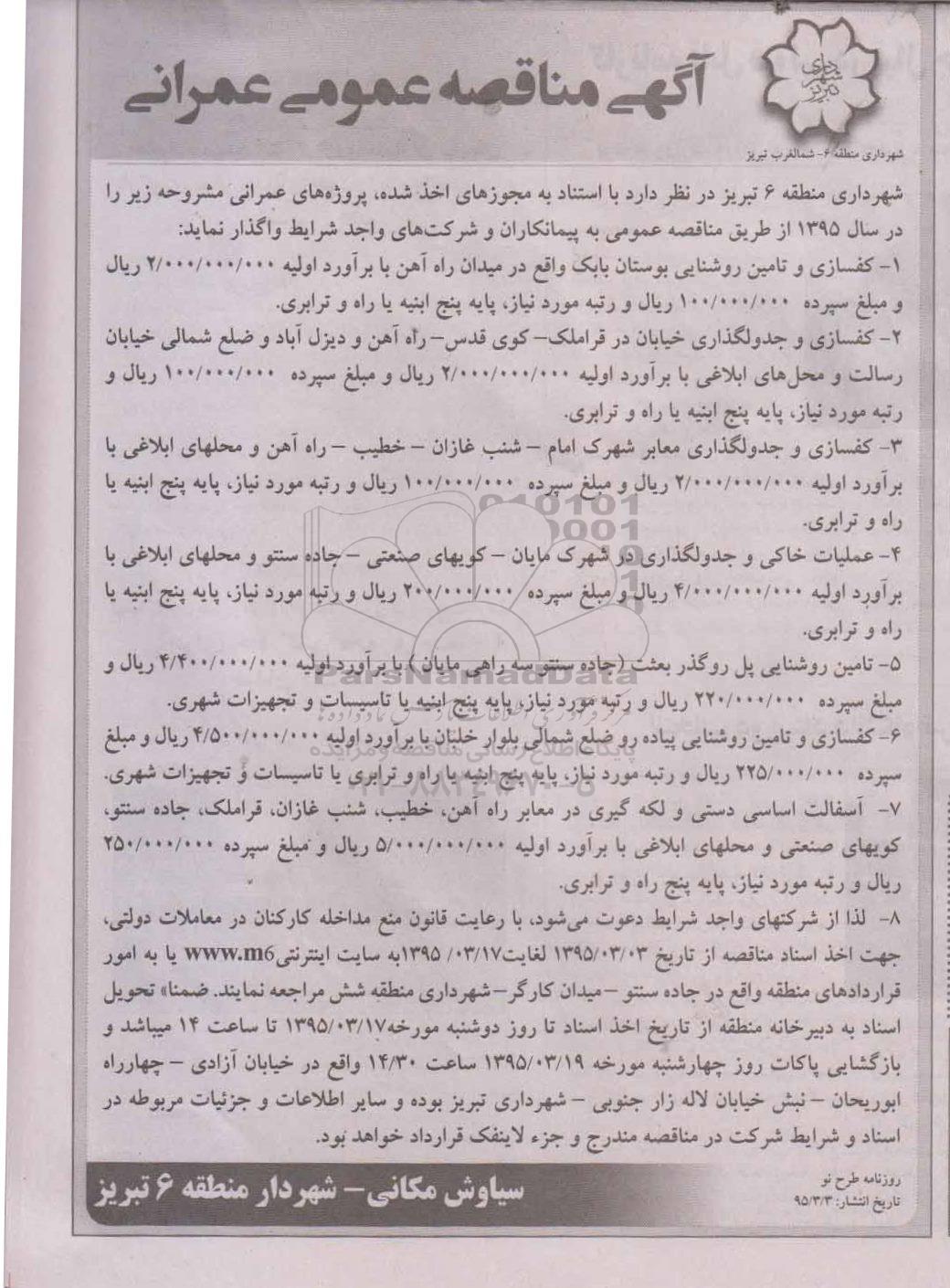 شهرداری منطقه 6 تبریز در نظر دارد با استناد به مجوزهای اخذ شده ، پروژه های عمرانی مشروحه زیر را در سال 1395 از طریق مناقصه عمومی به پیمانکاران و شرکتهای واجد شرایط واگذار نماید: