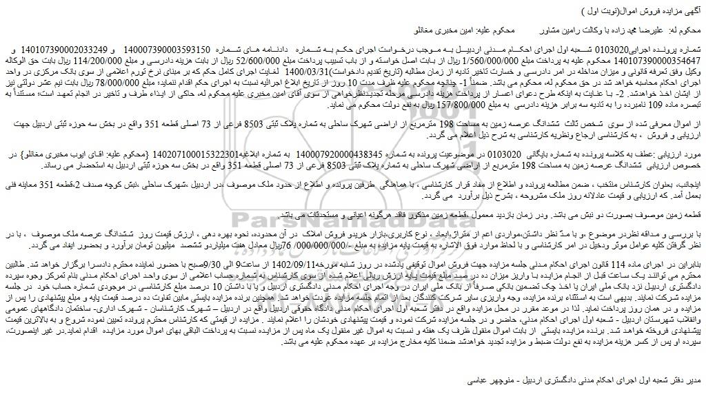 مورد ارزیابی :عطف به کلاسه پرونده به شماره بایگانی 0103020 در موضوعیت پرونده به شماره 140007920000438345 به شماره ابلاغیه140207100015322301 {محکوم علیه: اقای ایوب مخبری مغانلو} در خصوص ارزیابی ششدانگ عرصه زمین به مساحت 198 مترمربع از اراضی شهرک ساحلی به شماره پلاک ثبتی 8503 فرعی از 73 اصلی قطعه 351 واقع در بخش سه حوزه ثبتی اردبیل به استحضار می رساند.