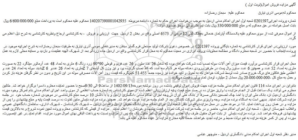 شماره پرونده اجرایی0201597 شعبه اول اجرای احکام مدنی اردبیل به موجب درخواست اجرای حکم به شماره دادنامه مربوطه  140207390001042935 محکوم علیه محکوم است به پرداخت مبلغ 6/600/000/000 ریال بابت اصل خواسته در حق محکوم له و مبلغ 330/000/000 ریال بابت نیم عشردولتی درحق صندوق دولت.