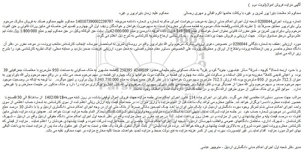 شماره پرونده اجرایی0200044 شعبه اول اجرای احکام مدنی اردبیل به موجب درخواست اجرای حکم به شماره و شماره دادنامه مربوطه 140107390002239797 محکوم علیهم محکوم هستند به فروش ماترک مرحوم ولی بایرام پور مطابق صرفاً بند 1 نظریه کارشناسی(قطعه ملک موسوم به قطعه مسکونی مخروبه) نسبت به سهم مورث خواهان و خواندگان ردیف اول الی چهارم و تقسیم ثمن حاصله فی مابین وراث قانونی و حین الفوت مرحوم ولی بایرام پور ثمرین بر طبق مقررات قانونی بعنوان اصل خواسته و مبلغ 4/149/388 ریال بابت هزینه دادرسی و مبلغ 42/000/000ریال بابت حق الوکاله وکیل در حق محکوم لهم و مبلغ 1/800/000 ریال بابت نیم عشردولتی درحق صندوق دولت. جهت ارزیابی و فروش جهت پرداخت محکوم به ، به کارشناسی ارجاع ونظریه کارشناسی به شرح ذیل اعلام می گردد.
