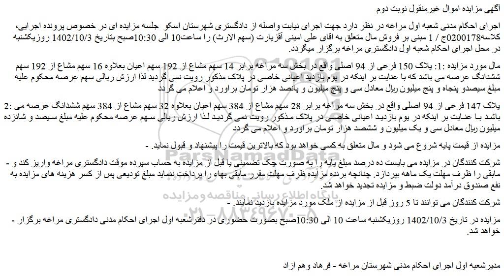 مال مورد مزایده :1: پلاک 150 فرعی از 94 اصلی واقع در بخش سه مراغه برابر 14 سهم مشاع از 192 سهم اعیان بعلاوه 16 سهم مشاع از 192 سهم ششدانگ عرصه می باشد که با عنایت بر اینکه در یوم بازدید اعیانی خاصی در پلاک مذکور رویت نمی گردید لذا ارزش ریالی سهم عرصه محکوم علیه مبلغ سیصدو پنجاه و پنج میلیون ریال معادل سی و پنج میلیون و پانصد هزار تومان براورد و اعلام می گردد