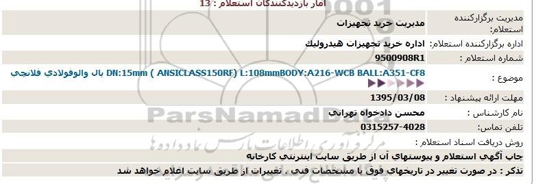 موضوع : DN:15mm ( ANSICLASS150RF) L:108mmBODY:A216-WCB BALL:A351-CF8 بال والوفولادی فلانچی مهلت ارائه پیشنهاد : 1395/03/08
