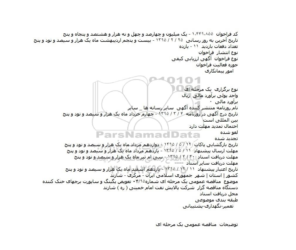 موضوع مناقصه عمومی یک مرحله ای شماره۰۴/۹۵ تعویض پگینگ و ساپورت برجهای خنک کننده