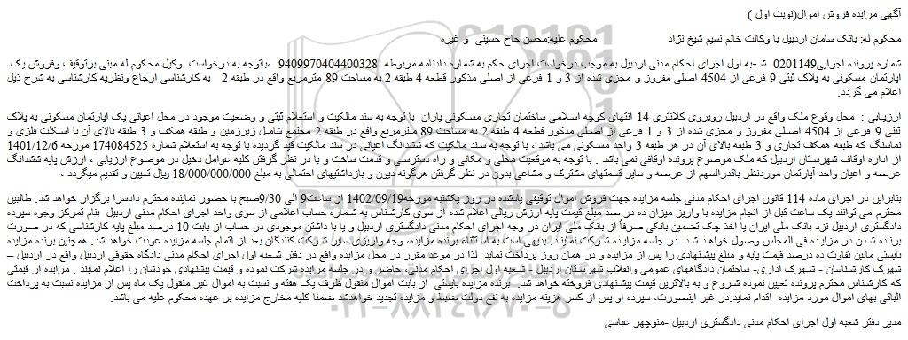 شماره پرونده اجرایی0201149 شعبه اول اجرای احکام مدنی اردبیل به موجب درخواست اجرای حکم به شماره دادنامه مربوطه 9409970404400328 ،باتوجه به درخواست وکیل محکوم له مبنی برتوقیف وفروش یک اپارتمان مسکونی به پلاک ثبتی 9 فرعی از 4504 اصلی مفروز و مجزی شده از 3 و 1 فرعی از اصلی مذکور قطعه 4 طبقه 2 به مساحت 89 مترمربع واقع در طبقه 2 به کارشناسی ارجاع ونظریه کارشناسی به شرح ذیل اعلام می گردد.
