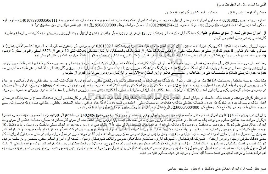 مورد ارزیابی :عطف به ابلاغیه الکترونیکی دریافت شده این جانبان کارشناسان منتخب هیئت سه نفرۀ پروندۀ کلاسۀ 0201302 درخصوص طرح دعوی محکوم له خانم فریبا عاصم کفّاش به طرفیّت محکوم علیه آقای شاپور گل محمدی ننه کران مبنی بر محکومیّت مالی و ارزیابی سه دانگ مشاع از شش دانگ یک دستگاه آپارتمان خدماتی به پلاک ثبتی 12 فرعی از 6573 اصلی واقع در بخش 2 اردبیل (تصویر سند مضبوط در پرونده) به نشانی میدان شریعتی – ابتدای خیابان شهید مصطفی خمینی (دکتر نایبی) – ابتدای کوچه توپچیلار - طبقۀ چهارم ساختمان دکتر شریعتی 33