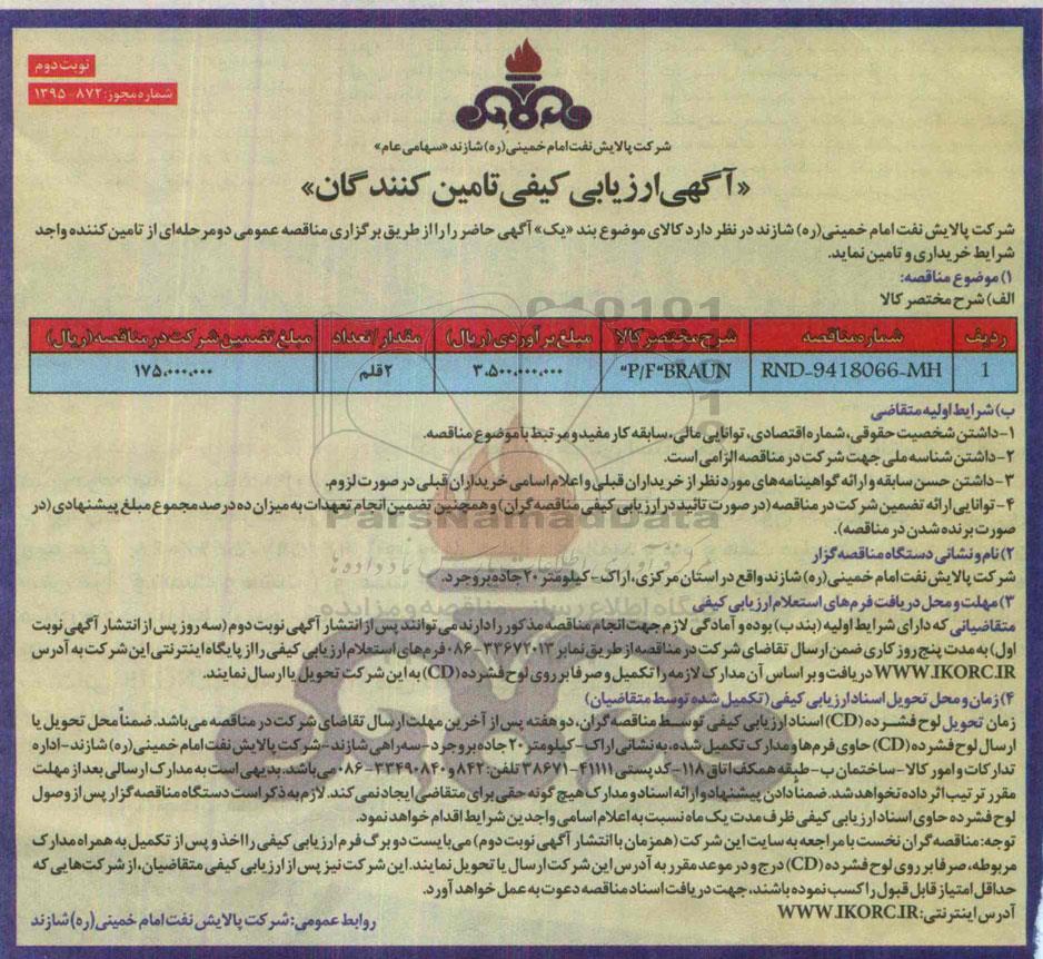 مناقصه P/F BRAUN - نوبت دوم, مناقصه, مناقصه P/F BRAUN - نوبت دوم