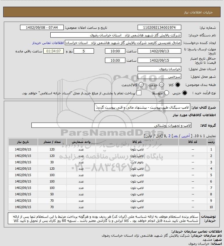 شرح کلی نیاز: لامپ سیگنال طبق پیوست - پیشنهاد مالی و فنی پیوست گردد.