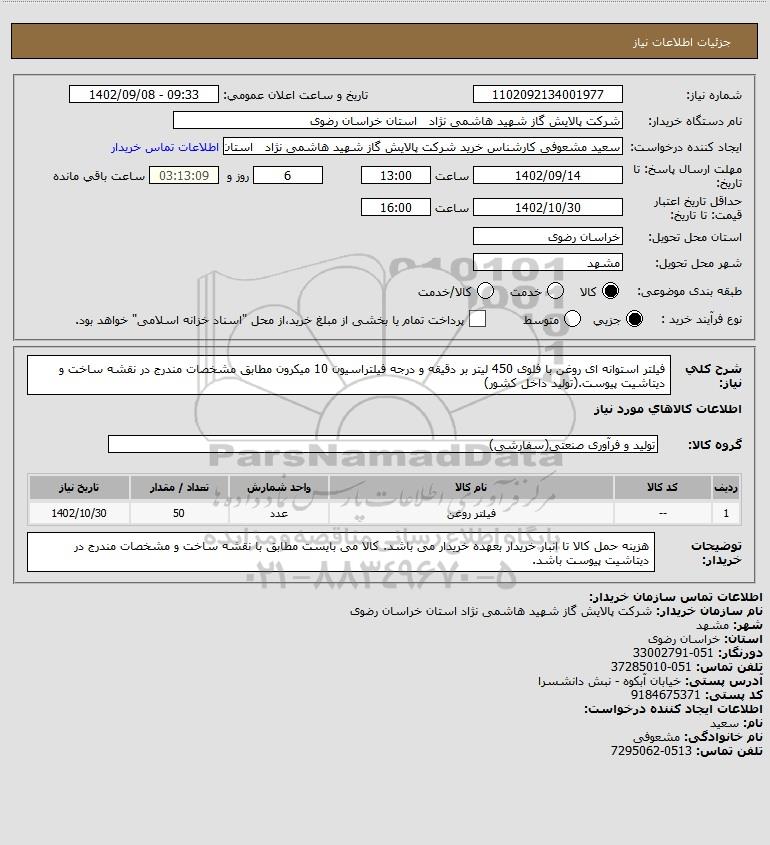نام دستگاه خریدار:شرکت پالایش گاز شهید هاشمی نژاد استان خراسان رضوی