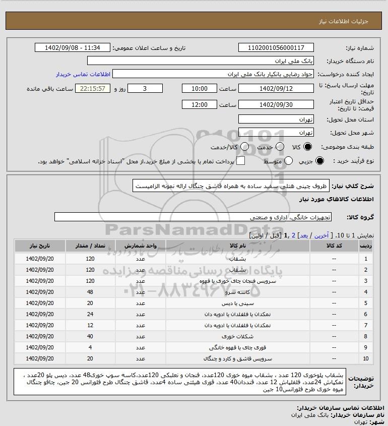 | 10 | -- | سرویس قاشق و کارد و چنگال | عدد | 20 | 1402/09/20 |