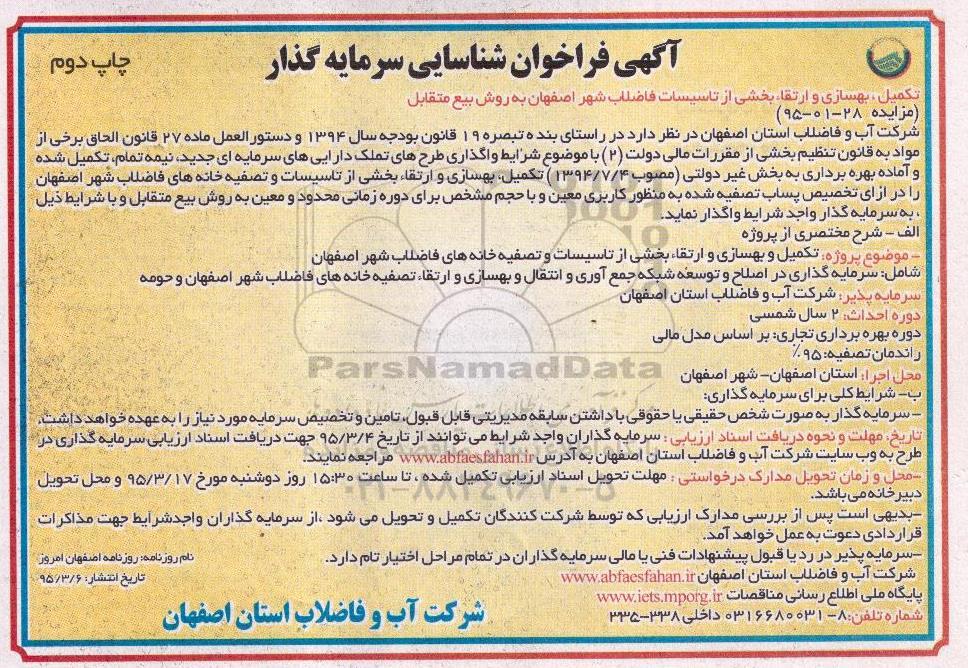 شرکت آب و فاضلاب استان اصفهان در نظر دارد تکمیل، بهسازی و ارتقاء بخشی از تاسیسات و تصفیه خانه های فاضلاب شهر اصفهان را در ازای تخصیص پساب تصفیه شده به منظور کاربری معین و با حجم مشخص برای دوره محدوده و معین به روش بیع متقابل و با شرایط  ذیل به سرمایه گذار واجد شرایط واگذار نماید.