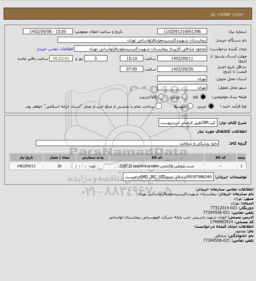 شرح کلی نیاز: کیتCRPطبق الزامات خریدپیوست