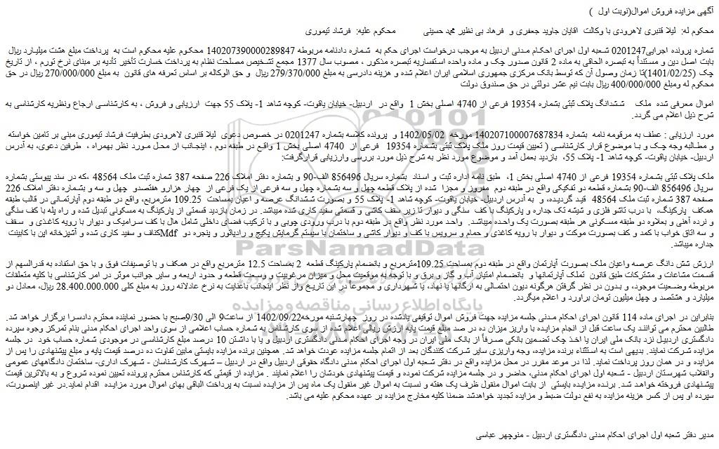 شماره پرونده اجرایی0201247 شعبه اول اجرای احکام مدنی اردبیل به موجب درخواست اجرای حکم به شماره دادنامه مربوطه 140207390000289847 محکوم علیه محکوم است به پرداخت مبلغ هشت میلیارد ریال بابت اصل دین و مستنداً به تبصره الحاقی به ماده 2 قانون صدور چک و ماده واحده استفساریه تبصره مذکور ، مصوب سال 1377 مجمع تشخیص مصلحت نظام به پرداخت خسارت تأخیر تأدیه بر مبنای نرخ تورم ، از تاریخ چک (1401/02/25)تا زمان وصول آن که توسط بانک مرکزی جمهوری اسلامی ایران اعلام شده و هزینه دادرسی به مبلغ 279/370/000 ریال و حق الوکاله بر اساس تعرفه های قانون به مبلغ 270/000/000 ریال در حق محکوم له ومبلغ 400/000/000 ریال بابت نیم عشر دولتی در حق صندوق دولت