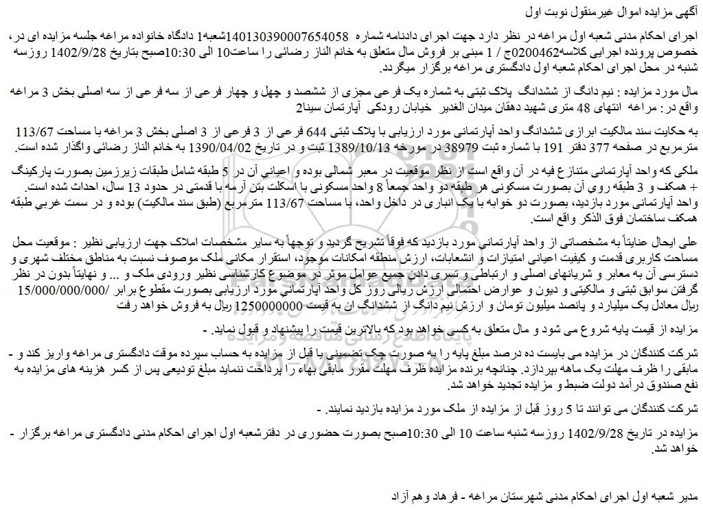 متن آگهی: آگهی مزایده اموال غیرمنقول نوبت اول ،اجرای احکام مدنی شعبه اول مراغه در نظر دارد جهت اجرای دادنامه شماره  140130390007654058شعبه1 دادگاه خانواده مراغه جلسه مزایده ای در خصوص پرونده اجرایی کلاسه0200462ج / 1 مبنی بر فروش مال متعلق به خانم الناز رضائی را ساعت10 الی 10:30صبح بتاریخ 1402/9/28 روزسه شنبه در محل اجرای احکام شعبه اول دادگستری مراغه برگزار میگردد. مال مورد مزایده : نیم دانگ از ششدانگ  پلاک ثبتی به شماره یک فرعی مجزی از ششصد و چهل و چهار فرعی از سه فرعی از سه اصلی بخش 3 مراغه واقع در: مراغه  انتهای 48 متری شهید دهقان میدان الغدیر  خیابان رودکی  آپارتمان سینا2 به حکایت سند مالکیت ابرازی ششدانگ واحد آپارتمانی مورد ارزیابی با پلاک ثبتی 644 فرعی از 3 فرعی از 3 اصلی بخش 3 مراغه با مساحت 113/67 مترمربع در صفحه 377 دفتر 191 با شماره ثبت 38979 در مورخه 1389/10/13 ثبت و در تاریخ 1390/04/02 به خانم الناز رضائی واگذار شده است. ملکی که واحد آپارتمانی متنازع فیه در آن واقع است از نظر موقعیت در معبر شمالی بوده و اعیانیِ آن در 5 طبقه شامل طبقات زیرزمین بصورت پارکینگ + همکف و 3 طبقه رویِ آن بصورت مسکونی هر طبقه دو واحد جمعاً 8 واحد مسکونی با اسکلت بتن آرمه با قدمتی در حدود 13 سال، احداث شده است. واحد آپارتمانی مورد بازدید، بصورت دو خوابه با یک انباری در داخل واحد، با مساحت 113/67 مترمربع (طبق سند مالکیت) بوده و در سمت غربیِ طبقه همکف ساختمان فوق الذکر واقع است. علی ایحال عنایتاً به مشخصاتی از واحد آپارتمانیِ مورد بازدید که فوقاً تشریح گردید و توجهاً به سایر مشخصات املاک جهت ارزیابی نظیر : موقعیت محل مساحت کاربری قدمت و کیفیت اعیانی امتیازات و انشعابات، ارزش منطقه امکانات موجود، استقرار مکانی ملک موصوف نسبت به مناطق مختلف شهری و دسترسی آن به معابر و شریانهای اصلی و ارتباطی و تسری دادنِ جمیع عوامل موثر در موضوع کارشناسی نظیر ورودی ملک و ... و نهایتاً بدون در نظر گرفتن سوابق ثبتی و مالکیتی و دیون و عوارض احتمالی ارزش ریالی روز کل واحد آپارتمانیِ مورد ارزیابی بصورت مقطوع برابر /15/000/000/000 ریال معادل یک میلیارد و پانصد میلیون تومان و ارزش نیم دانگ از ششدانگ ان به قیمت 1250000000 ریال به فروش خواهد رفت - مزایده از قیمت پایه شروع می شود و مال متعلق به کسی خواهد بود که بالاترین قیمت را پیشنهاد و قبول نماید. - شرکت کنندگان در مزایده می بایست ده درصد مبلغ پایه را به صورت چک تضمینی یا قبل از مزایده به حساب سپرده موقت دادگستری مراغه واریز کند و مابقی را ظرف مهلت یک ماهه بپردازد. چنانچه برنده مزایده ظرف مهلت مقرر مابقی بهاء را پرداخت ننماید مبلغ تودیعی پس از کسر هزینه های مزایده به نفع صندوق درآمد دولت ضبط و مزایده تجدید خواهد شد. - شرکت کنندگان می توانند تا 5 روز قبل از مزایده از ملک مورد مزایده  بازدید نمایند. - مزایده در تاریخ 1402/9/28 روزسه شنبه ساعت 10 الی 10:30صبح بصورت حضوری در دفترشعبه اول اجرای احکام مدنی دادگستری مراغه برگزار خواهد  شد.                                                         مدیر شعبه اول اجرای احکام مدنی شهرستان مراغه - فرهاد وهم آزاد