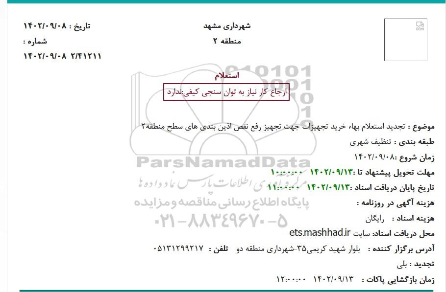 موضوع : تجدید استعلام بهاء خرید تجهیزات جهت تجهیز رفع نقص اذین بندی های سطح منطقه2