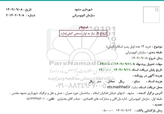 استعلام بها و موضوع استعلام استعلام خرید 14 عدد اویل پمپ اسکانیا (اصلی) به اطلاع کلیه شرکتها و افراد متخصص واجد شرایط میرساند، آگهی گذار در نظر دارد از طریق استعلام بها، نسبت به انتخاب و دریافت پیشنهادات اقدام نماید. این استعلام با کد آگهی ثبت شده در سامانه خبرگزاری پارس نماد : 6704913 منتشر شده است. مشخصات استعلام : تاریخ شروع استعلام: 1402/09/09 آخرین مهلت ارسال پیشنهاد قیمت : 1402/09/11 و محل اجرای پروژه : استان خراسان رضوی میباشد. استعلام قیمت مورد درخواست : استعلام خرید 14 عدد اویل پمپ اسکانیا (اصلی) با دستهبندیهای تخصصی و گروه های مرتبط : الکتروموتور و پمپ های شناور, تامین،تعمیرات و اجاره خودروهای سنگین و نیمه سنگین, قطعات خودرو, استعلام اطلاع رسانی میگردد.