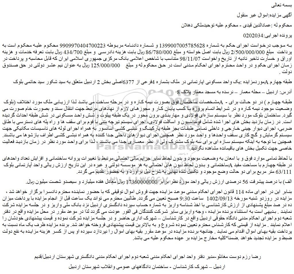 موردمزایده :یک واحد مسکونی اپارتمانی در ملک بشماره 4فرعی از 6377اصلی بخش 2 اردبیل متعلق به سید شکور سید حاتمی بلوک A طبقه چهارم