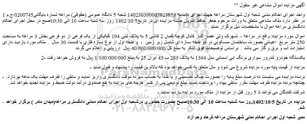 "آگهی مزایده اموال مشاعی غیر منقول "
