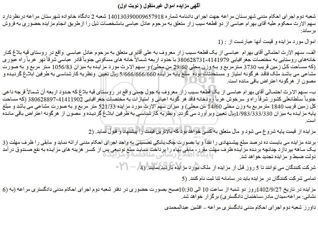 شعبه دوم اجرای احکام مدنی شهرستان مراغه جهت اجرای دادنامه شماره 140130390009657918 شعبه 2 دادگاه خانواده شهرستان مراغه درنظردارد سهم الارث محکوم علیه آقای بهرام عباسی از دو قطعه سیب زار متعلق به مرحوم عادل عباسی بامشخصات ذیل را ازطریق انجام مزایده حضوری به فروش برساند: