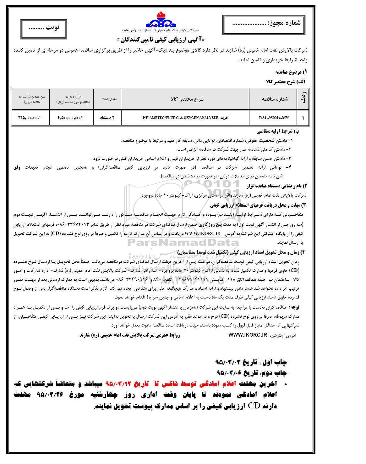 مناقصه خرید P/F" AMETEC"FLUE OXYGEN ANALYZER از کلیه افراد متخصص و شرکتها واجد شرایط دعوت به عمل میآید در مناقصه با کد خبرگزاری پارس نماد: 670670 شرکت نمایند.