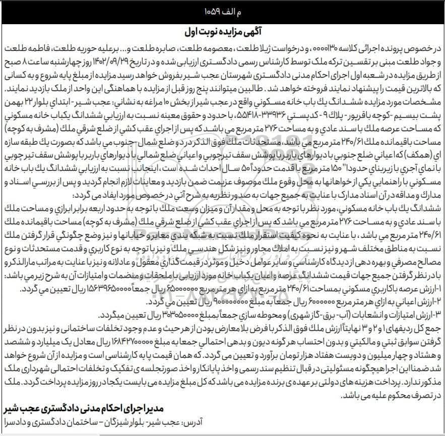 مزایده فروش ششدانگ یک باب خانه مسکونی واقع در عجب شیر