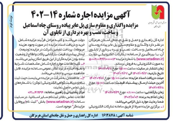اداره کل راهداری و حمل و نقل جاده ای استان هرمزگان در نظر دارد واگذاری و مقاوم سازی پل عابر پیاده روستای چاه اسماعیل و ساخت، نصب و بهره برداری از تابلوی آن ، با بهره گیری از سامانه تدارکات الکترونیکی دولت ستاد ایران و با شماره مزایده 5002004221000013 به صورت الکترونیکی به فروش برساند.