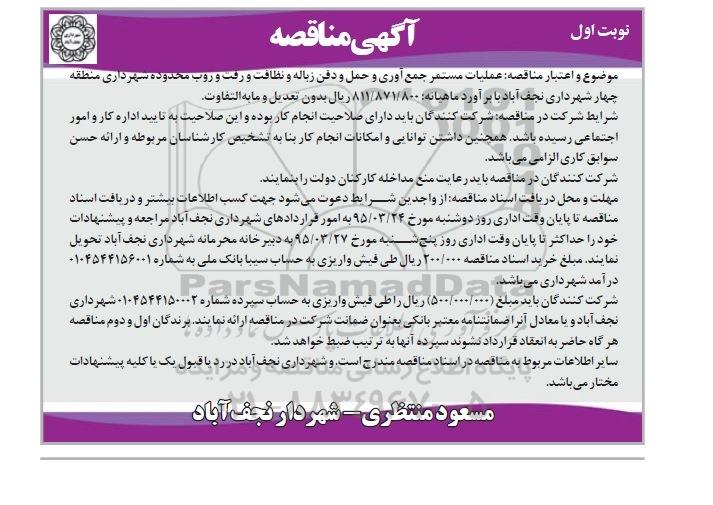 موضوع و اعتبار مناقصه: عملیات مستمر جمع آوری و حمل و دفن زباله و نظافت و رفت و روب محدوده شهرداری منطقه چهار شهرداری نجف آباد با برآورد اولیه به مبلغ 811.871.800 ریال بدون تعدیل و ما به التفاوت