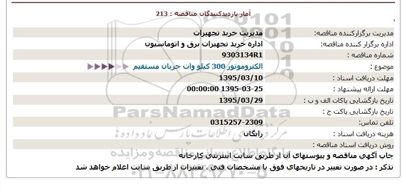 مناقصه الکتروموتور 300 کیلو وات جریان مستقیم, مناقصه , مناقصه الکتروموتور 300 کیلو وات جریان مستقیم