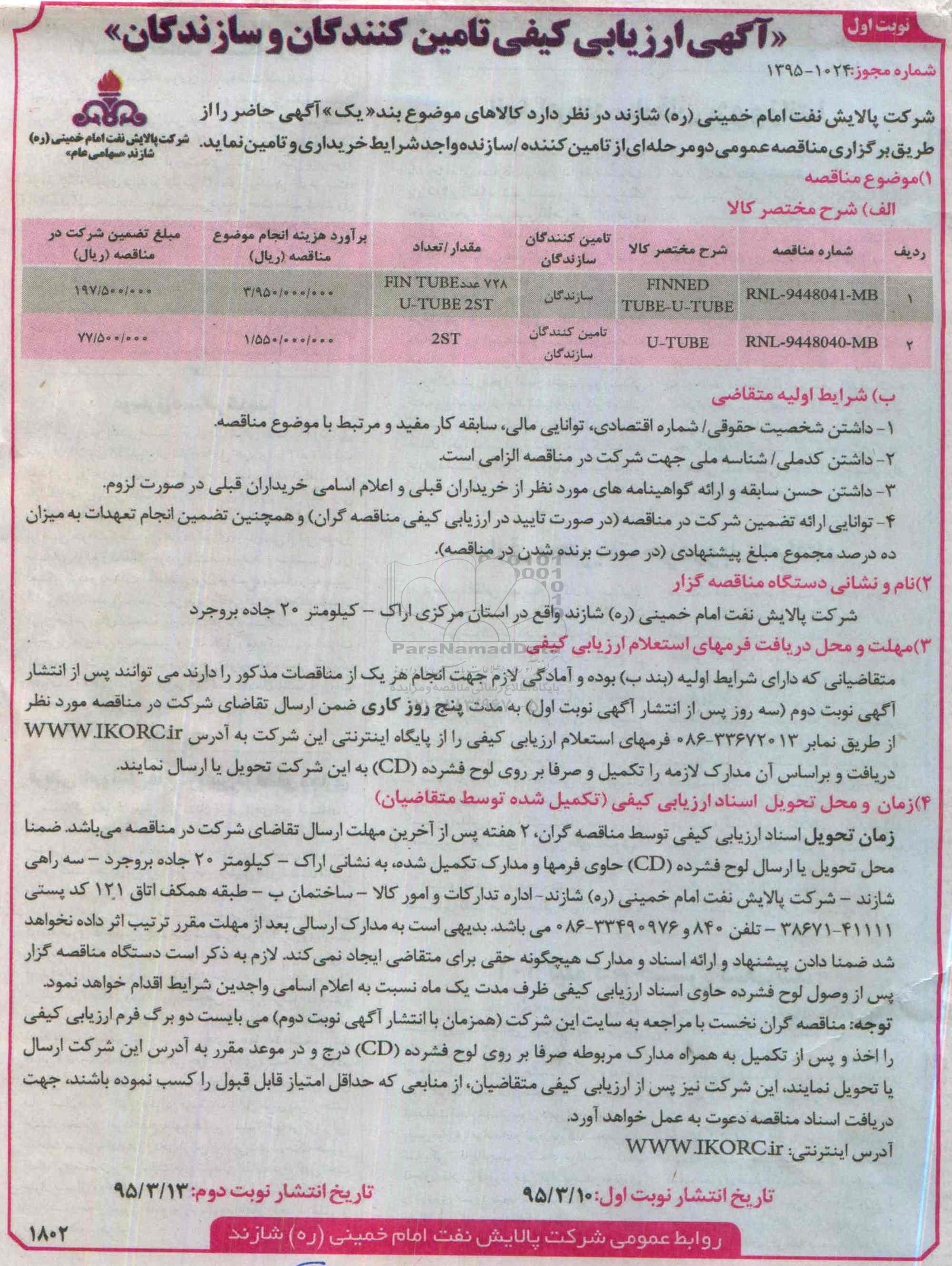 مناقصه FINNED TUBE-U-TUBE, آگهی ارزیابی کیفی تامین کنندگان و سازندگان , مناقصه FINNED TUBE-U-TUBE